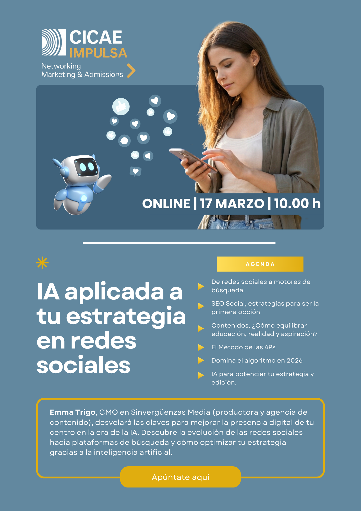 Esta sesión se enmarca dentro de las actvidades impulsadas dentro del proyecto CICAEImpulsa, cuyo objetivo es acompañar y apoyar a los departamentos de Marketing de los colegios mediante espacios de formación, reflexión y encuentro con profesionales de referencia.