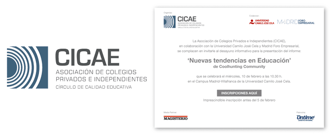 La Asociación de Colegios Privados e Independientes (CICAE), en colaboración con Madrid Foro Empresarial y la Universidad Camilo José Cela (Institución Educativa SEK), organiza la presentación del estudio Nuevas tendencias en Educación, elaborado por el Observatorio de Tendencias, de la empresa Coolhunting Community, en el que se da cuenta de las nuevas líneas emergentes en el entorno educativo y de cómo es posible anticiparse a los cambios que se preven en la enseñanaza.