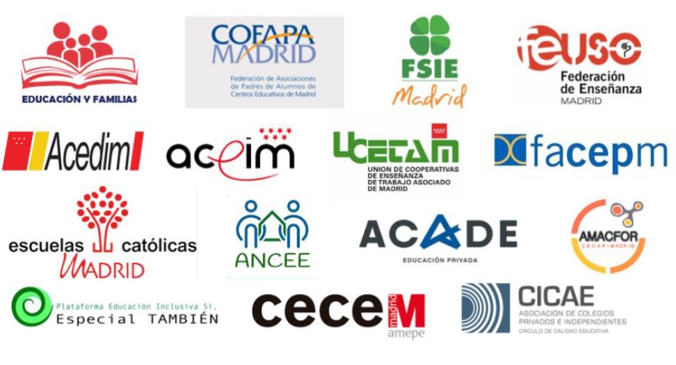 Suscriben esta declaración: Federación de Ampas de Colegios Católicos de la Comunidad de Madrid (Educación y Familias), Federación de Asociaciones de Padres de Alumnos de Centros Educativos de Madrid (COFAPA Madrid), Sindicato Independiente de Enseñanza (FSIE-Madrid), Federación de Enseñanza Sindicato USO Madrid (FEUSO-Madrid), Asociación de Centros de Enseñanza de Idiomas de Madrid (ACEDIM), Asociación de Centros de Educación Infantil de Madrid (ACEIM), Unión de Cooperativas del Trabajo Asociado de Madrid (UCETAM), Federación Autonómica de Centros de Enseñanza Privada de Madrid (FACEPM), Escuelas Católicas de Madrid (ECM), Asociación Nacional de Centros de Educación Especial (ACNEE), Asociación Madrileña de Empresas y Centros de Formación en Madrid (AMACFOR), Asociación de Centros Autónomos de Enseñanza Privada (ACADE), Plataforma Inclusiva Sí, Especial TAMBIÉN, Asociación Madrileña de Empresas Privadas de Enseñanza (CECE-Madrid), Asociación de Colegios Privados e Independientes (CICAE)