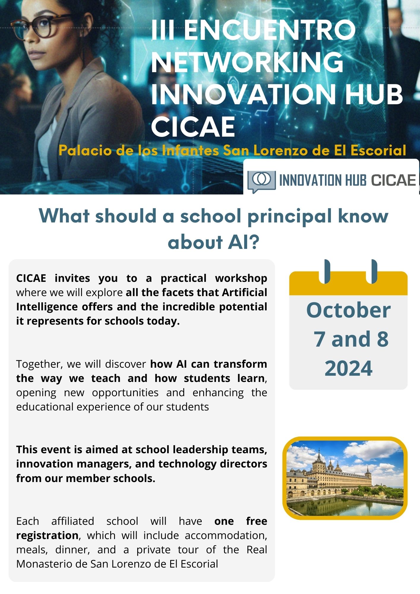 On October 7 and 8, 2024 in San Lorenzo del Escorial, in addition to a full agenda on a topic such as AI, aimed at management teams, innovation and technology managers of our schools, we will enjoy moments of leisure and networking with a private visit to the Royal Monastery of El Escorial and a very special dinner with other managers, colleagues and collaborators.