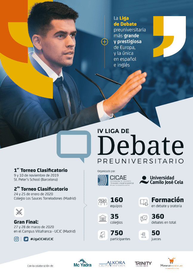 La cuarta edición de la Liga de Debate CICAE – UCJC cuenta con la colaboración del Área de Educación del Grupo Planeta, Mc Yadra, Alkora, Trinity College of London y Material Escolar.