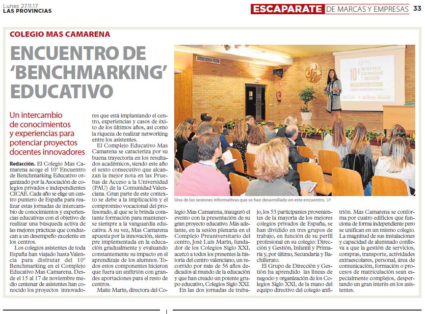 El periódico valenciano Las Provincias se hace eco del 10º Benchmarking Educativo organizado por CICAE en Valencia. Los centros de la Asociación viajaron hasta el Complejo Educativo Mas Camarena para conocer sus proyectos innovadores en educación, sus casos de éxito, así como experiencias en la gestión y organización del colegio. El evento supuso una oportunidad enriquecedora para el intercambio de conocimientos entre el medio centenar de asistentes.