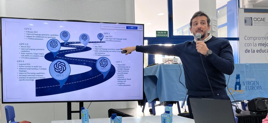 El aprendizaje sobre el papel de la inteligencia artificial en la enseñanza continuó al día siguiente. Carlos Rabazo, experto en IA y transformación digital en Telefónica, lideró una jornada dirigida a directivos y gerentes de los colegios de CICAE, donde se analizaron herramientas prácticas para mejorar la toma de decisiones y la eficiencia organizativa mediante la IA.